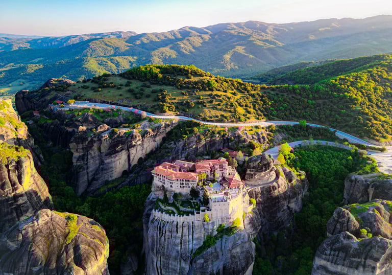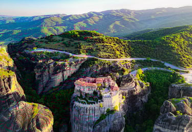 A UNESCO World Heritage site with monasteries perched on massive natural rock towers.